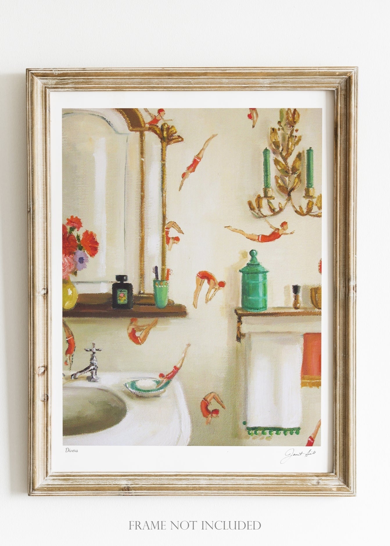 The Divers Art Print is a perfect addition to any bathroom, featuring a stunning underwater scene with divers swimming through vibrant colors.